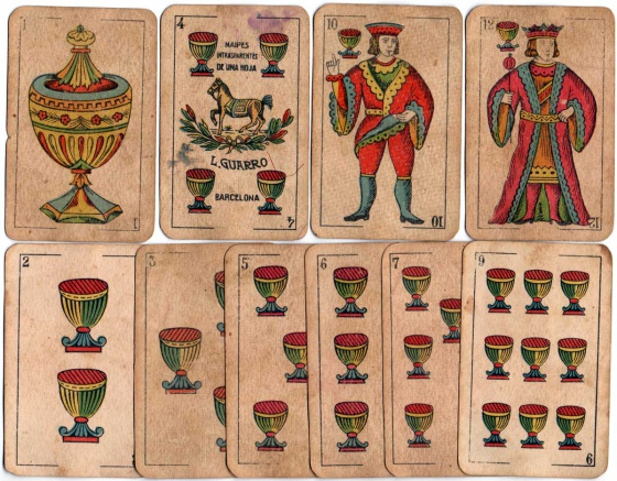 Los primeros naipes que llegaron a Europa procedían de la cuenca oriental del Mediterráneo, es decir, Siria, Líbano, Israel y el norte de Egipto, y se conocen como cartas mamelucas. Los símbolos eran la copa, la espada, el denario (equivalente al oro actual) y el palo (similar al basto). Según Jean-Pierre Garrigue, especialista en la historia de los naipes y autor de “Las cartas de juego”. La primera mención a los naipes en un texto europeo se encuentra en Barcelona en 1371 y estos naipes fueron importados a Cataluña y se adaptaron con los mismos símbolos.
